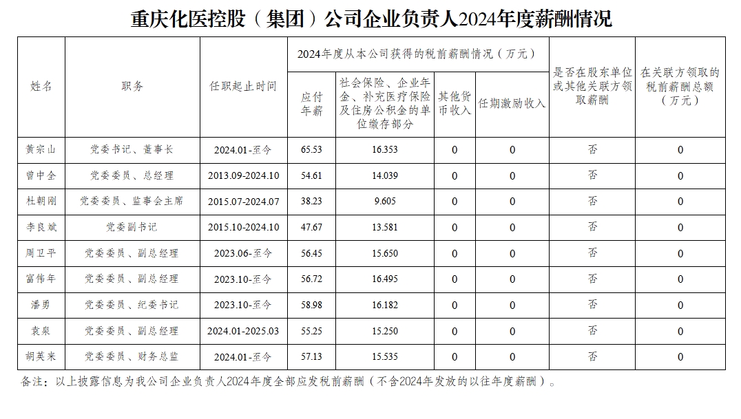 重慶化醫(yī)集團企業(yè)負責人2024年度薪酬情況